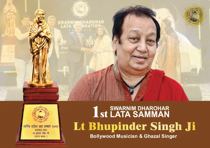In 2025, the first Swarnim Dharohar Lata Samman was posthumously conferred upon the legendary playback and Ghazal singer late Bhupinder Singh Ji, in recognition of his outstanding contribution to Indian music and his artistic association with Lata Ji. The award was graciously accepted by his wife, Mitali Singh, during the concluding ceremony of “Lata Mahotsav 2025” in Nava Raipur, Atal Nagar, amid warm tributes, special performances, and heartfelt celebrations by noted musicians and dancers.