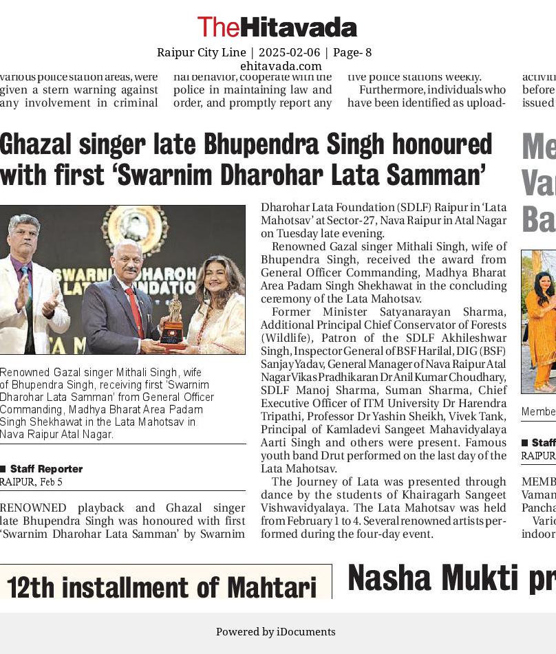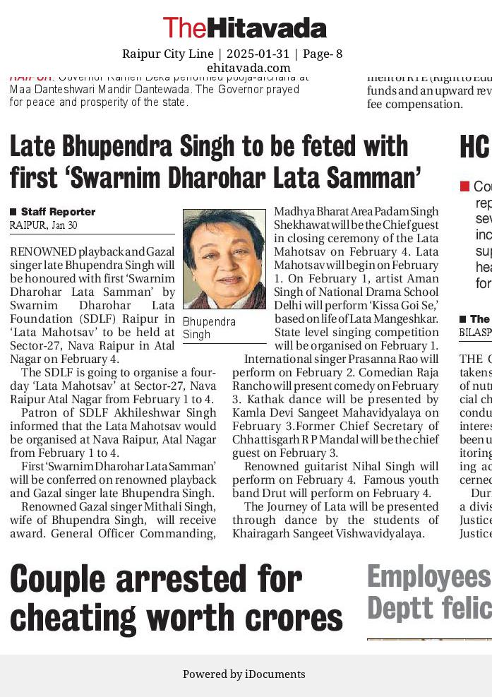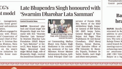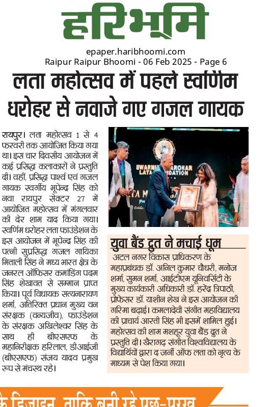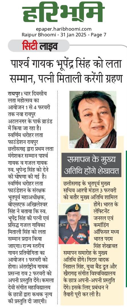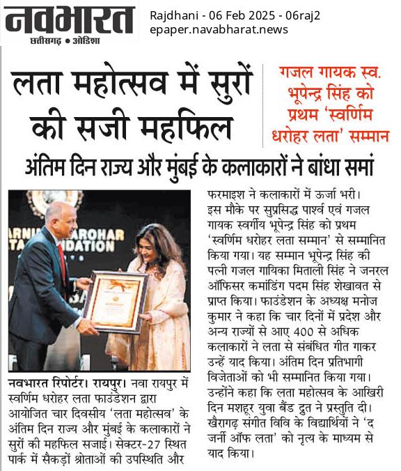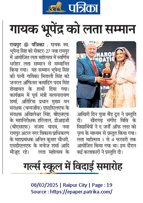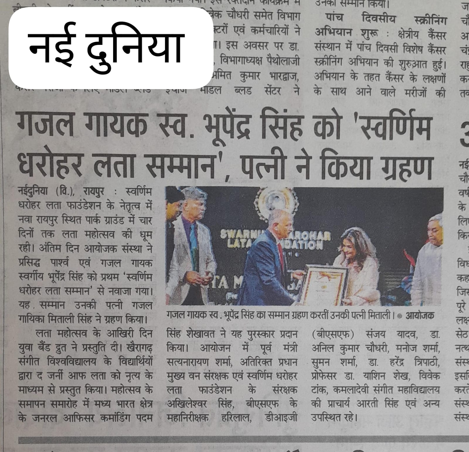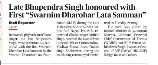 In 2025, the first Swarnim Dharohar Lata Samman was posthumously conferred upon the legendary playback and Ghazal singer late Bhupinder Singh Ji, in recognition of his outstanding contribution to Indian music and his artistic association with Lata Ji. The award was graciously accepted by his wife, Mitali Singh, during the concluding ceremony of “Lata Mahotsav 2025” in Nava Raipur, Atal Nagar, amid warm tributes, special performances, and heartfelt celebrations by noted musicians and dancers.
