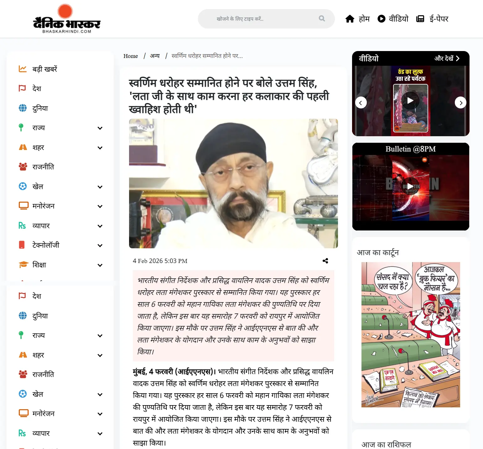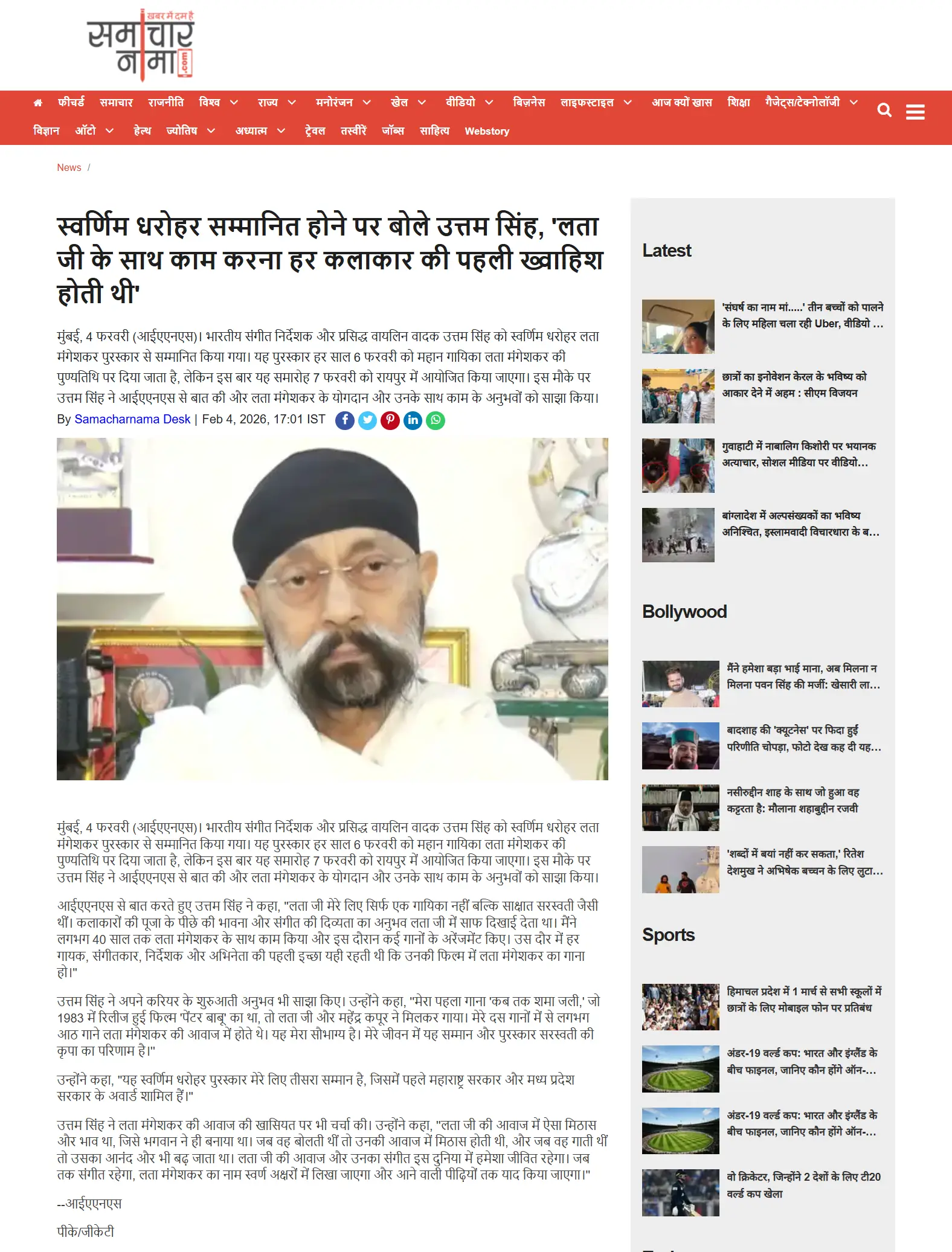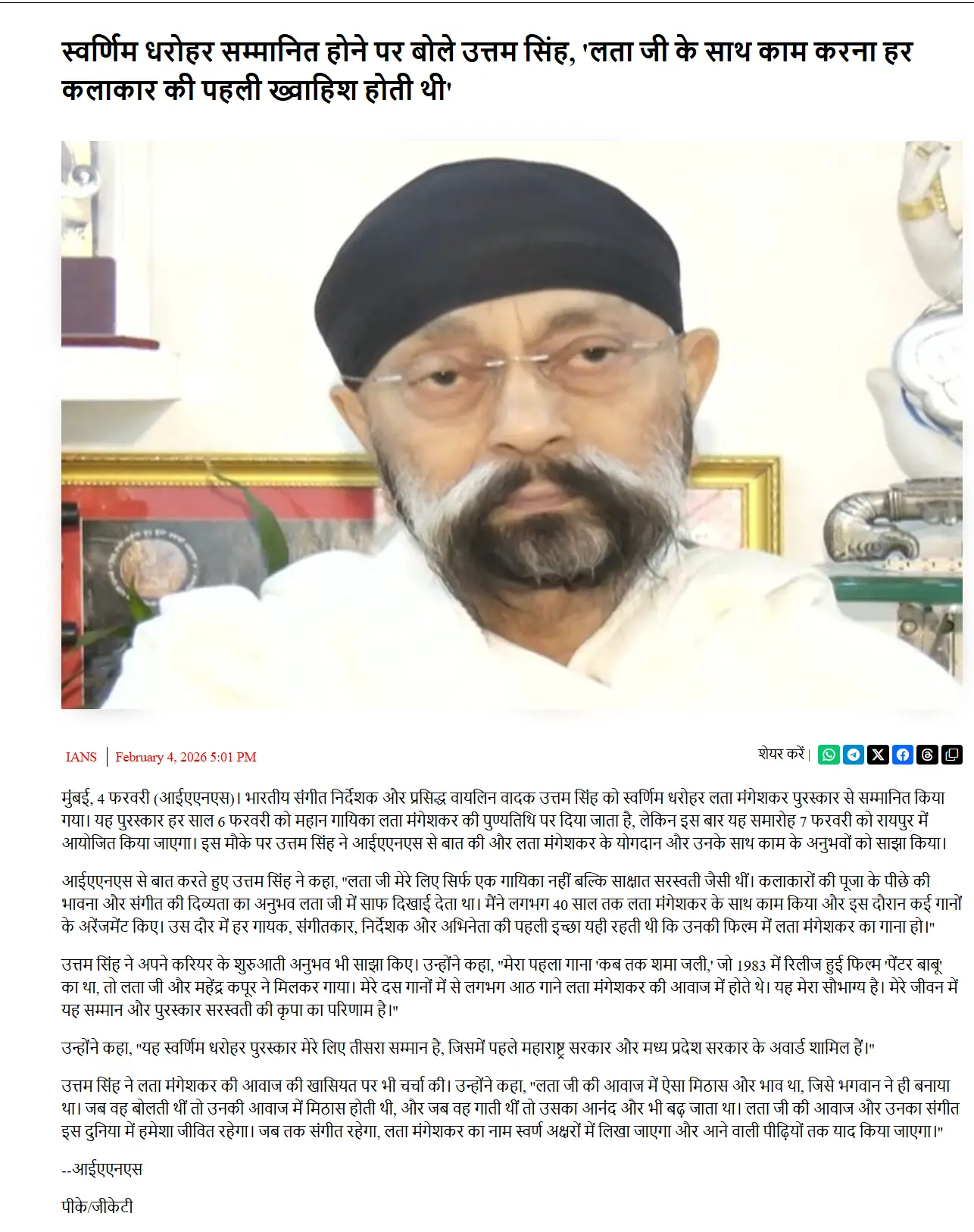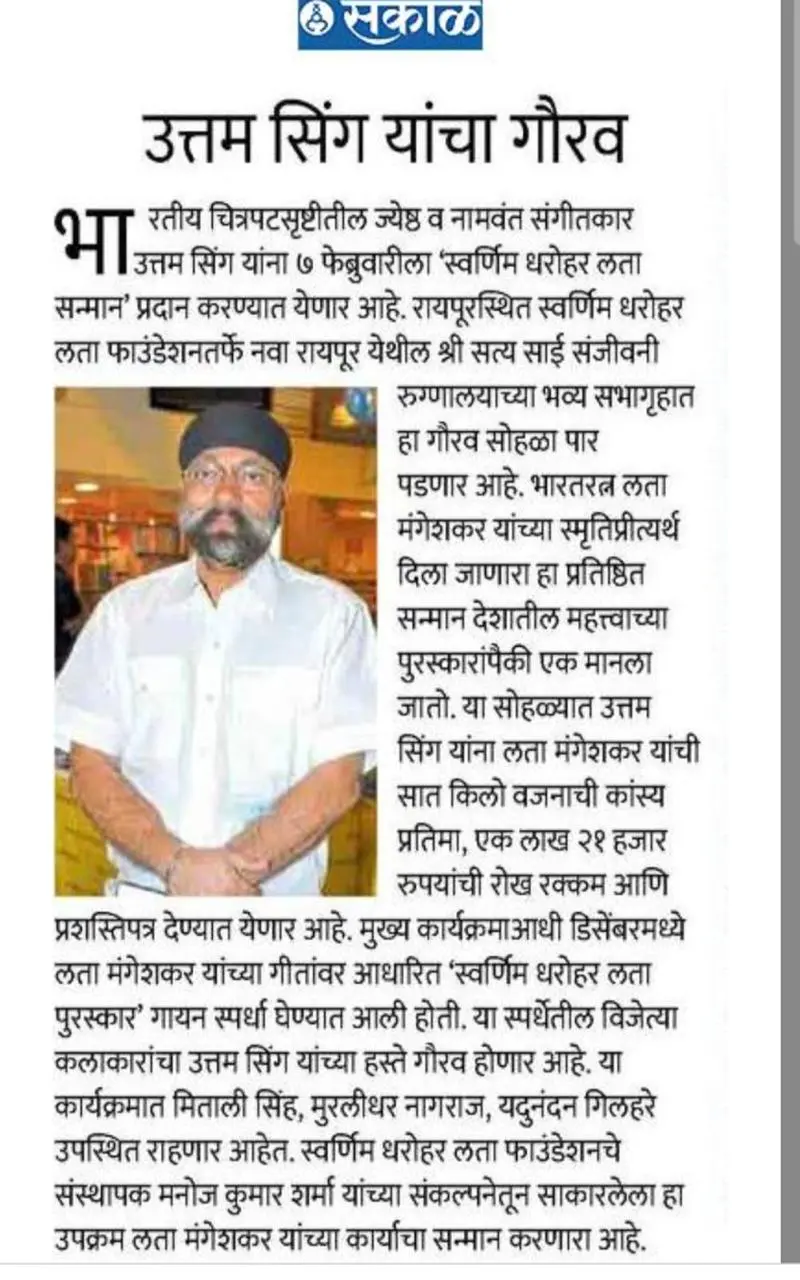 The Swarnim Dharohar Lata Samman 2026 will be bestowed upon the acclaimed Bollywood music director Shri Uttam Singh. Renowned for his exceptional contributions to Indian cinema and memorable musical works, Shri Uttam Singh exemplifies the spirit and legacy of Lata Mangeshkar Ji through his artistry and impact on the world of music.